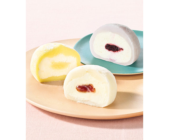 とちあいかのいちごソースに、パイナップルソース、ブルーベリーソースを北海道産生乳を使った濃厚な生クリームで包んだ3種の生クリーム大福です。生クリームの甘みにフルーツソースの甘酸っぱさが絶妙に絡む美味しさをお楽しみいただけます。