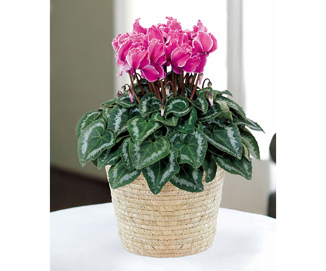 花弁の縁に細かい切れ込みがある「フリンジ咲き」。赤紫と白のコントラストが優美でロマンティックな印象のシクラメンです。