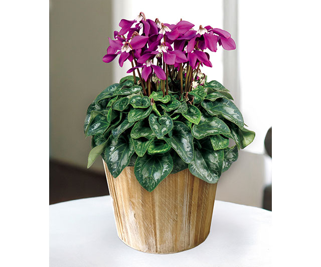 雪を被った冬の富士山を思わせるような白色と青紫色のコントラストが特徴のシクラメン。垂れ下がって咲く姿は可憐な雰囲気と上品な印象を与えます。