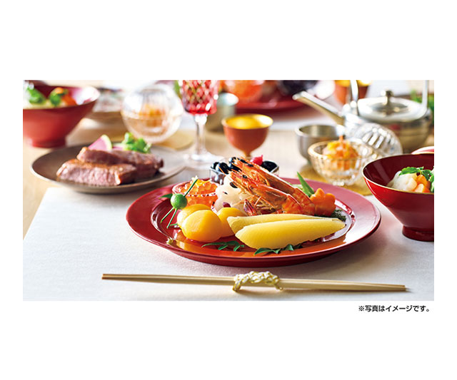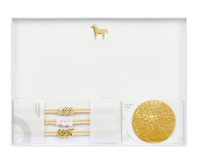馬の箔押しが施されたランチョンマットに、水引が箸置きとしても使える国産檜の丸箸。白と金色の和紙ならではの風合いが美しいマットは、コースターとしてもお使いいただけます。