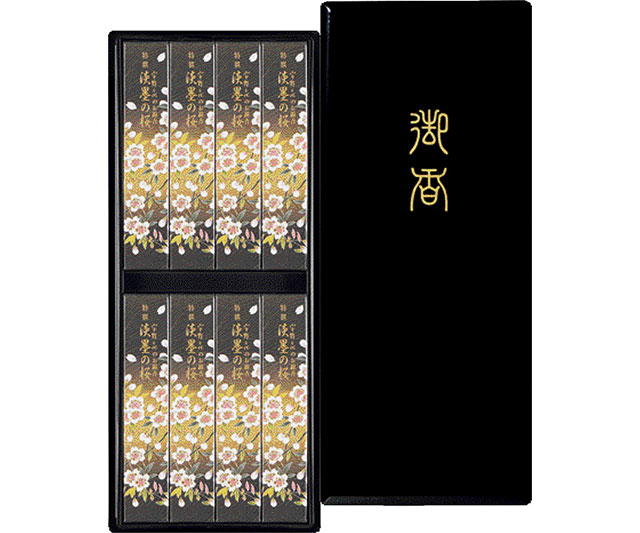 お悔やみの気持ちを込めて贈るにふさわしいご進物用のお線香です。白檀を配合した、優艶な桜の香りを、塗箱に収めてお届けします。