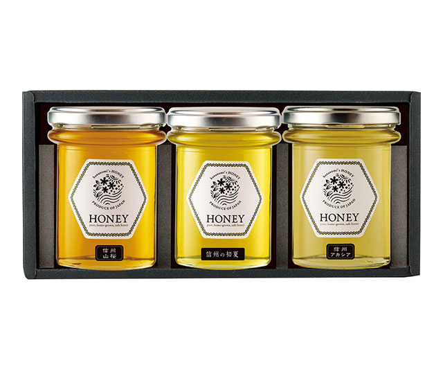 「信州山桜」は、ほのかにチェリーの香りが残る濃厚な蜂蜜。「信州アカシア」は淡く美しい色とやさしい香りの蜂蜜。「信州の初夏」は山桜・山藤・アカシアなどの花が咲いている時期にミツバチがブレンドした一期一会の蜂蜜。やさしい色と香りの信州産蜂蜜を詰め合わせました。
