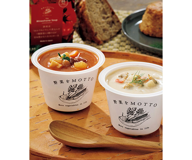 - レンジカップスープ(ミネストローネ・ポトフスープ・コーンポタージュ・クラムチャウダー・ボルシチ・かぼちゃ・ごぼう・白いミネストローネ各180g)