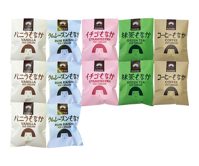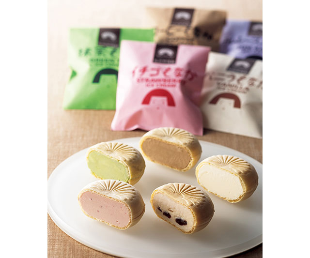 搾りたてのミルクを使った独自製法のアイスクリームを、手焼きの最中の皮で包みました。最中の皮は食べる直前にオーブントースターで焼くとパリッと香ばしくなり、より美味しく召しあがれます。5つのフレーバーのうち「ラムレーズン味」は三越伊勢丹限定です。