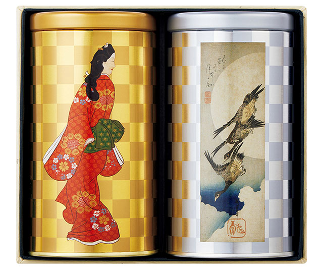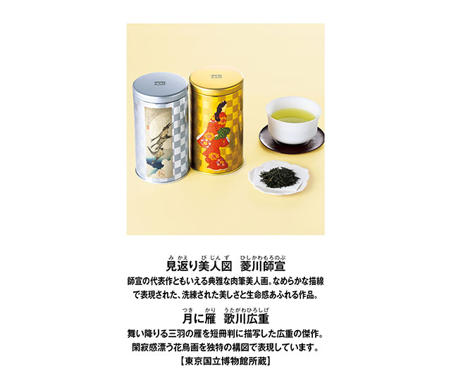 お茶本来の香りとまろやかな味わいの掛川煎茶と、爽やかな香りで甘みと渋みが調和した川根煎茶を「見返り美人図」(菱川師宣)と「月に雁」(歌川広重)を描いた限定缶に詰めました。風情のあるひとときをお楽しみください。