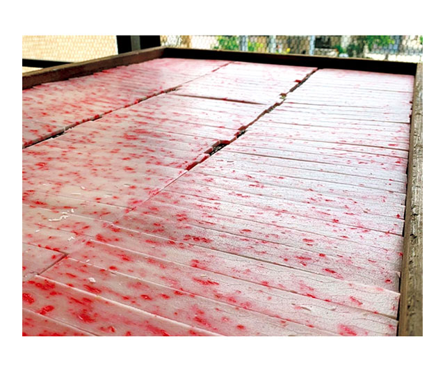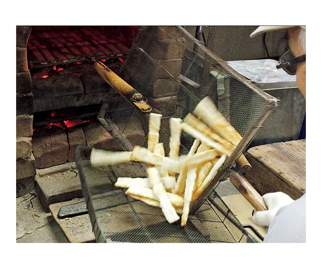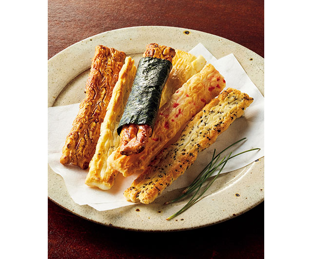 杵つきした佐賀県産ヒヨクモチの風味を飛ばさぬようじっくりと自然乾燥で生地を仕上げ、熟練の職人技で一本一本丁寧に焼きあげました。えび・ごま・青のり・白・たまり・海苔巻きの6種類の味がお楽しみいただける、細長い棒状の炭火手焼おかきです。