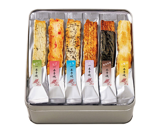 - 一本手焼(えび・ごま・青のり・白・たまり・海苔巻き×各5)