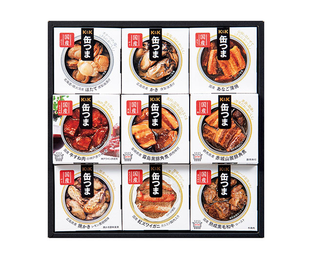 - 缶つま(国産熟成黒毛和牛ロースト・国産紅ズワイガニカニミソ脚肉入り・広島県産かき燻製油漬け各60g、広島県産焼かきレモン黒胡椒味70g、国産あなご蒲焼80g、国産牛すね肉の神戸赤ワイン煮160g、群馬県産赤城山麓豚角煮・宮崎県産霧島黒豚角煮各150g、北海道噴火湾産ほたて燻製油漬け55g)/プルトップ缶