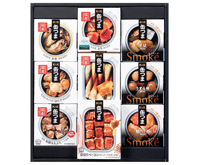 缶つま(広島県産かき燻製油漬け60g、九州産ぶりあら炊き150g、日本近海獲り和風サーディン・厚切りベーコンのハニーマスタード味各105g、北海道噴火湾産ほたて燻製油漬け55g、国産和豚もちぶたハツ塩味45g)、缶つまSmoke(鮭ハラス・さば各50g、うずら卵25g)/プルトップ缶