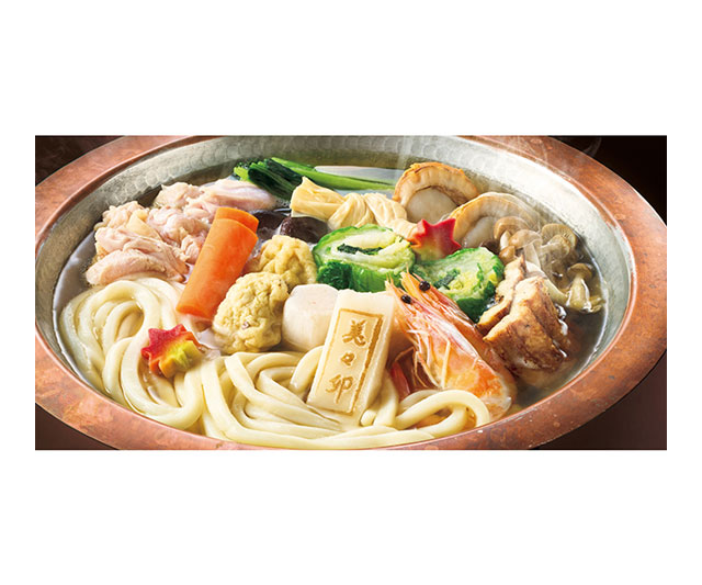 自慢の太打ちうどんと鶏肉、えび、焼き穴子に野菜などの山海の幸を、鰹と昆布でとった特製だしでお召しあがりいただけます。