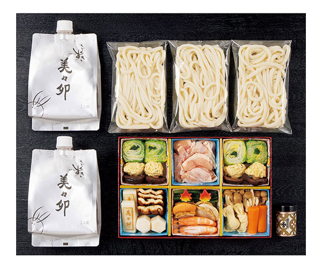 - 冷凍ゆでうどん200g×3、出汁800ml×2、具材(鶏肉、白菜巻(白菜、ほうれん草)、がんもどき煮物、味付き焼穴子、椎茸煮物、芋煮物、ほたて貝、しめじ、小松菜、もち、人参煮物、海老、湯葉、麩)、七味唐辛子(2人前)