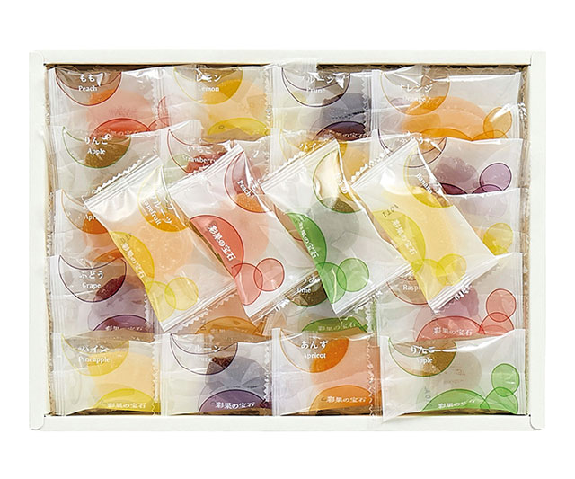 多彩な果実の風味をギュッと詰めた一口サイズのゼリー。一粒一粒がフルーツをかたどった愛らしいカタチは贈られた方の笑顔を誘います。