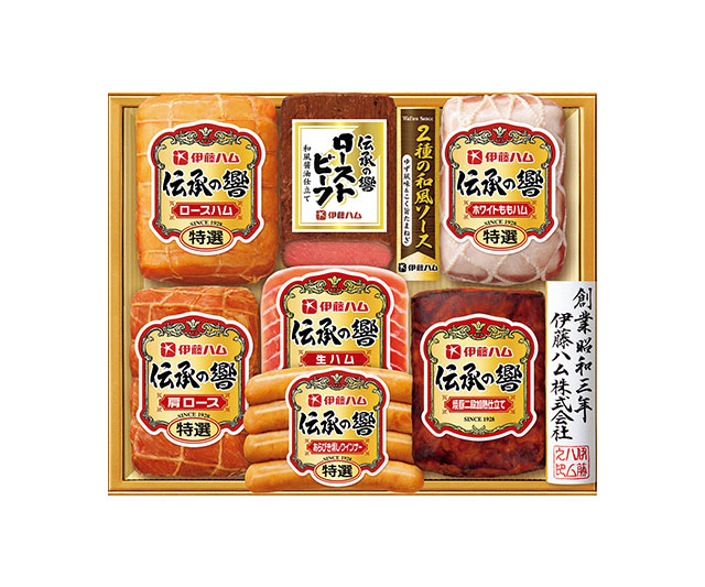 - ロースハム320g、ローストビーフ・肩ロース各180g、ホワイトももハム220g、焼豚二段加熱仕立て160g、あらびき燻しウインナー80g、生ハム45g、2種の和風ソース40g
