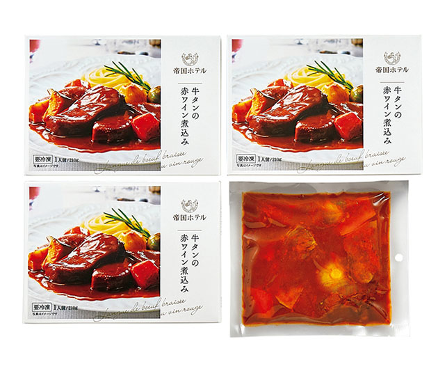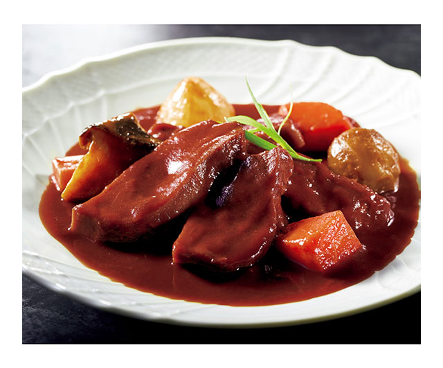 牛タンまるごとを香味野菜と赤ワインでマリネし、表面を焼いた後、フォンドヴォー・デミグラスソースでじっくりと時間をかけて煮込みました。牛タンの柔らかな食感とコク深いソースが絡み合い絶妙な味わいを生み出します。ヌードルと合わせるのもおすすめです。