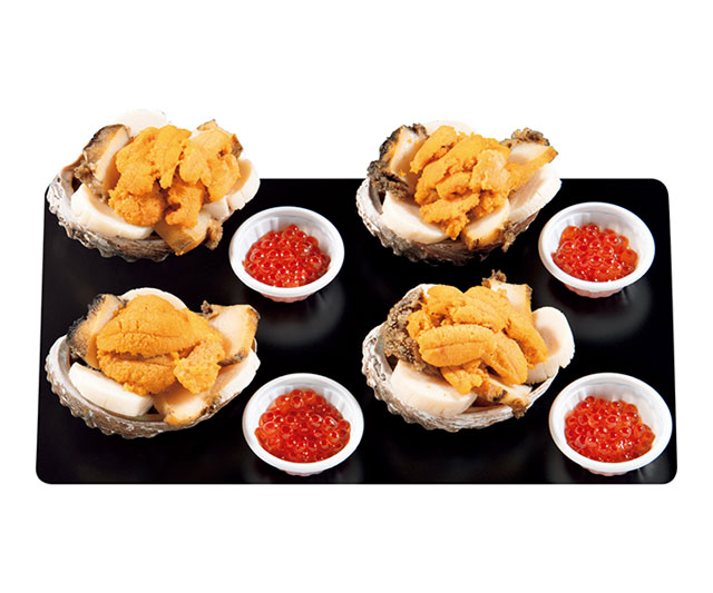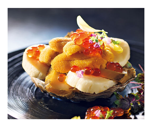 料理人がじっくりと目利きした海の幸を、〈中村家〉独自の技法で丁寧に下ごしらえ。しっとり柔らかなあわび、旨みの濃いうにと肉厚の帆立をあわびの殻にたっぷりと盛り付けました。殻ごと温めてから、いくらしょうゆ漬をのせてお召しあがりください。豊かな海の風味を存分にお楽しみいただける贅沢な味わいです。