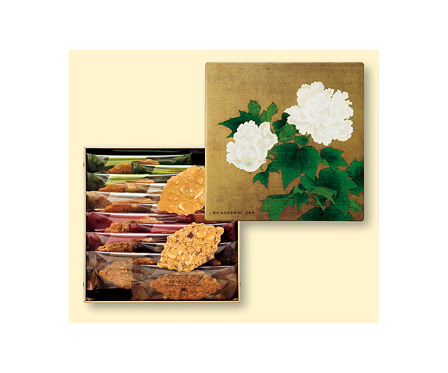 ナッツの香ばしさとチョコレートの甘さの絶妙なハーモニーが人気のファヤージュを、朝に咲く清らかな芙蓉を繊細な筆致で描いた美しい限定缶に詰め合わせました。
