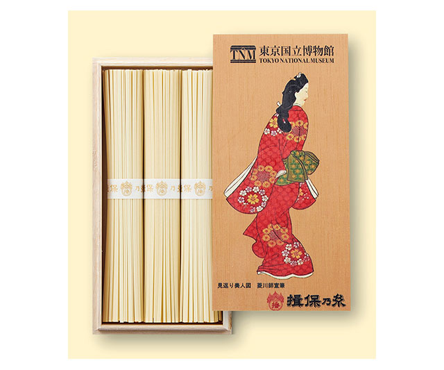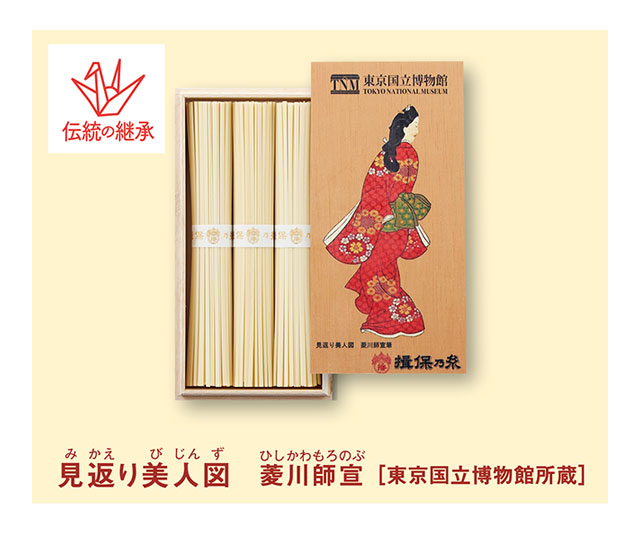つるりとした食感とコシが特徴の手延べうどん。振袖の模様や髪型に当時の流行を映し出す、華やかな肉筆画の限定箱でお届けします。