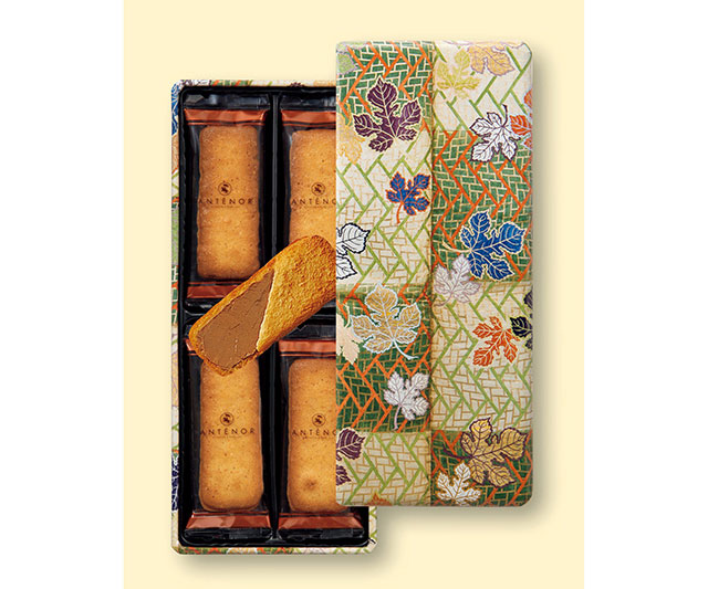 ココナッツクッキーにクーベルチュールチョコレートをサンドしたロングセラー。神聖とされる梶の葉を煌びやかに装飾した檜垣梶葉模様の限定缶も魅力のギフトです。