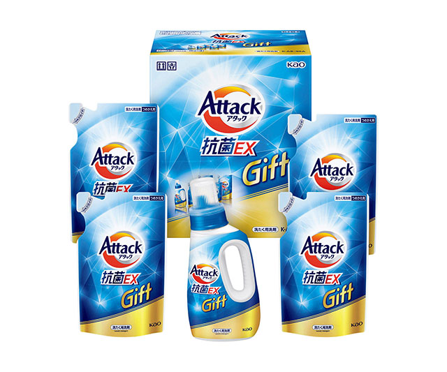 たくさんの洗濯物を洗う場合でも、汚れ・臭い・菌に浸透して洗浄力を発揮します。持ちやすくて注ぎやすいボトルの「アタック抗菌EX」ギフトです。