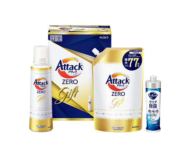 落ちにくい汚れ・生乾き臭・洗剤残りを「ゼロ」に近づけ、洗うほど衣類がよみがえる「ゼロ洗浄」の「アタックZERO」と食器用洗剤「キュキュット」をセットにした贈り物です。