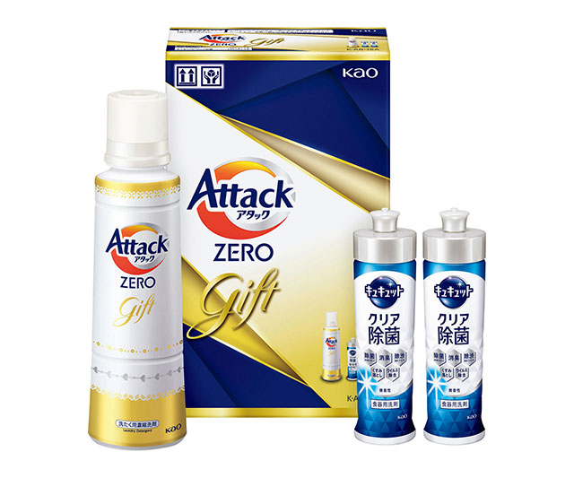 落ちにくい汚れ・生乾き臭・洗剤残りを「ゼロ」に近づけ、洗うほど衣類がよみがえる「ゼロ洗浄」の「アタックZERO」と食器用洗剤「キュキュット」をセットにした贈り物です。