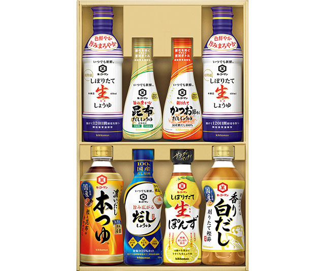 - しぼりたて生しょうゆ450ml×2、削りたてかつお節香るだししょうゆ200ml・旨み豊かな昆布だししょうゆ200ml・旨み広がるだししょうゆ330ml・しぼりたて生ぽんず360ml・濃いだし本つゆ500ml・旨みひろがる 香り白だし500ml×各1