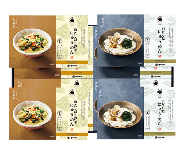 - 白だし蛤にゅうめん(麺50g、スープ、殻付はまぐり、わかめ、柚子七味)・鶏だし彩り野菜にゅうめん(麺50g、スープ、かやく)×各4