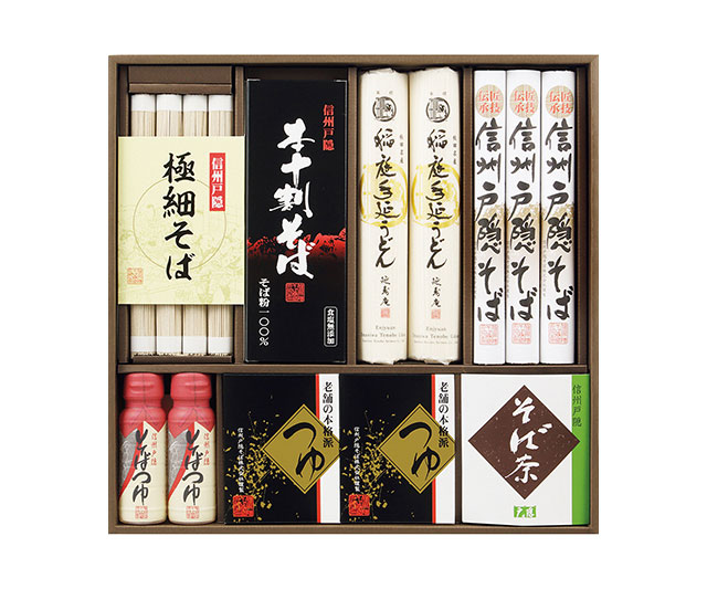 - 信州戸隠そば150g×3、極細そば(70g×4)×1、稲庭手延うどん130g×2、本十割そば150g×1、そばつゆ(50ml×4)×2、そばつゆ100ml×2、そば茶(8g×5)×1