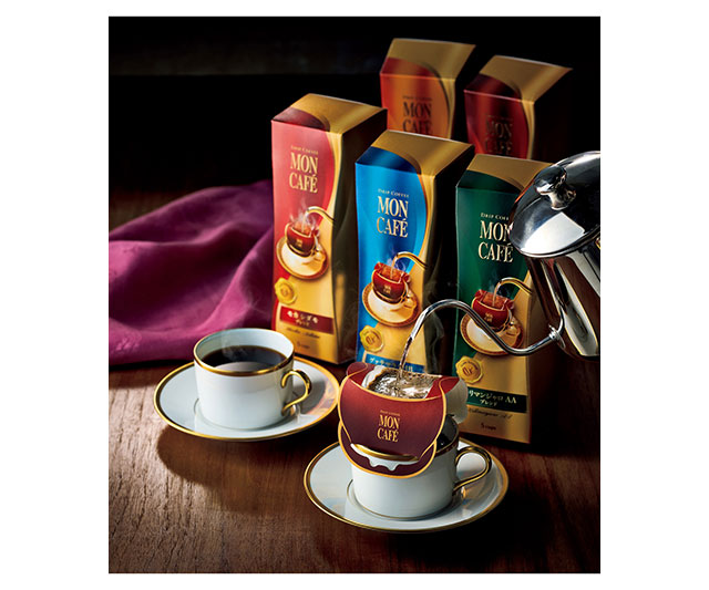 ハンドドリップで淹れるコーヒーの美味しさを追求し続けてきた〈モンカフェ〉。個包装にアルミ箔を使用するなど、豆の香りを逃さずパックする独自の技術開発によって、コーヒーの味わいの決め手となる「挽きたての香り」を楽しめるドリップコーヒーの商品化に成功。また、コーヒーに浸からないドリッパー構造フィルターによる雑味のないクリアな味わいを実現しました。今回ご紹介するセレクトギフトは、アラビカ種を主体に選び抜いた生豆を使用。個性あふれるさまざまなブレンドを楽しめる詰合せです。確かな品質と多彩な味わいで、コーヒー好きの方からもご好評いただいている〈モンカフェ〉のギフト。香り高い一杯で楽しむ豊かなひと時を、大切な方への贈り物にぜひ。
