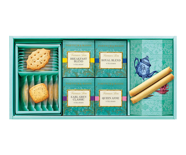- ロイヤルブレンド・クイーンアン×各8/英国製(茶葉:インド・スリランカ(セイロン))、アールグレイクラシック×8/英国製(茶葉:中国)、ブレックファスト×8/英国製(茶葉:インド)、ティーリーフビスケット×14、イングリッシュシガーロール×8/日本製