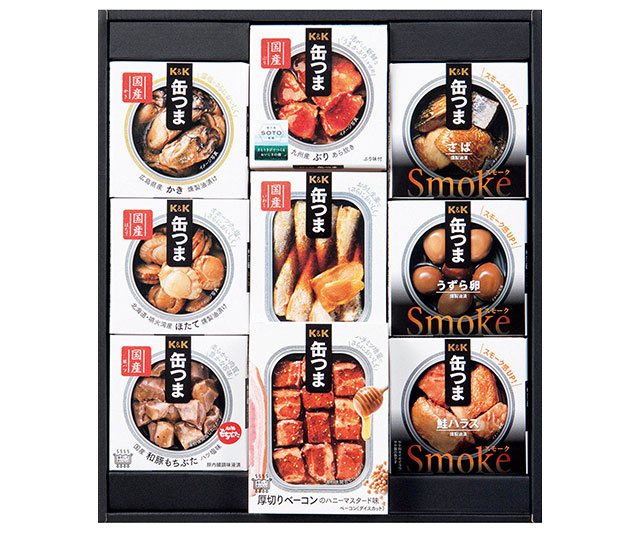 - 缶つま(広島県産かき燻製油漬け60g、九州産ぶりあら炊き150g、日本近海獲り和風サーディン・厚切りベーコンのハニーマスタード味各105g、北海道噴火湾産ほたて燻製油漬け55g、国産和豚もちぶたハツ塩味45g)、缶つまSmoke(鮭ハラス・さば各50g、うずら卵25g)/プルトップ缶
