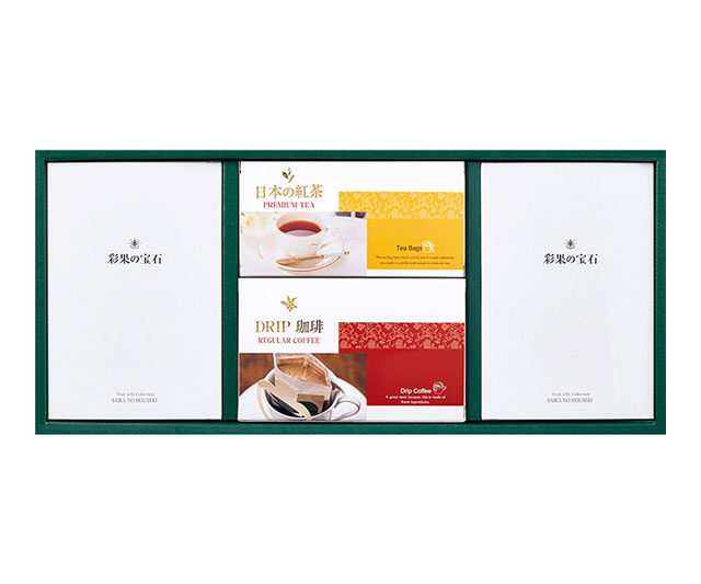 - 彩果の宝石(12個入)×2、珈琲(ブラジルブレンド7g×4)×1、日本の紅茶ティーバッグ(2g×5)×1