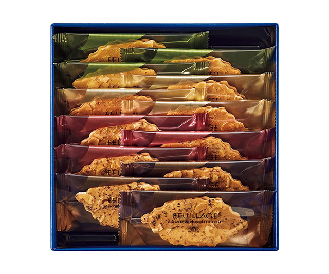 ナッツを敷き詰めて焼きあげた木の葉型のクッキーにチョコレートをサンド。香ばしくパリッとした軽い食感をお楽しみください。
