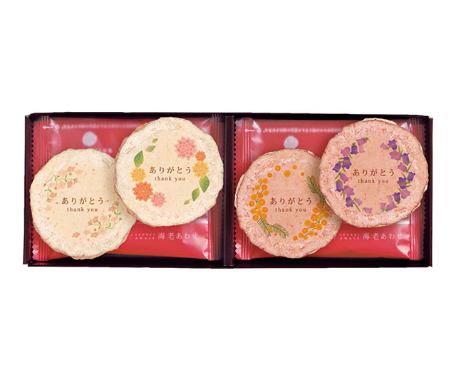 チーズをサンドした風味豊かな紅白せんべい。可愛らしい花のモチーフをあしらい、感謝の言葉を添えました。