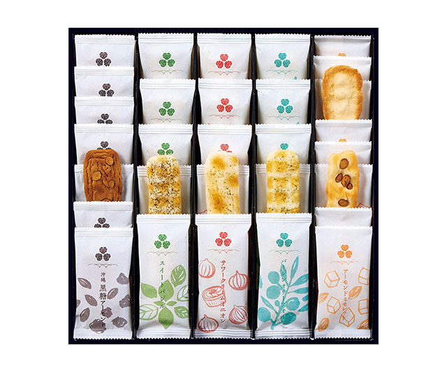 スモークチーズ・アーモンドミモレット×各4、バージンオリーブオイル・スイートバジル・サワークリームオニオン×各5、沖縄黒糖アーモンド×7