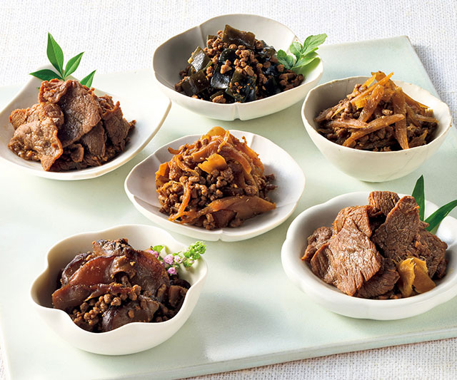 - 牛肉すきやき・牛肉しいたけ・牛肉やわらか煮・牛肉ごぼう・牛肉まいたけ・牛肉こんぶ各50g