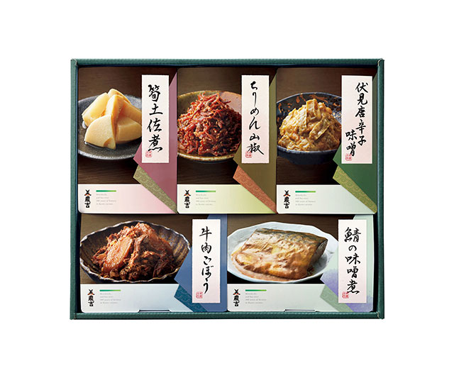 - ちりめん山椒・筍土佐煮各40g、牛肉ごぼう50g、伏見唐辛子味噌・鯖の味噌煮各60g