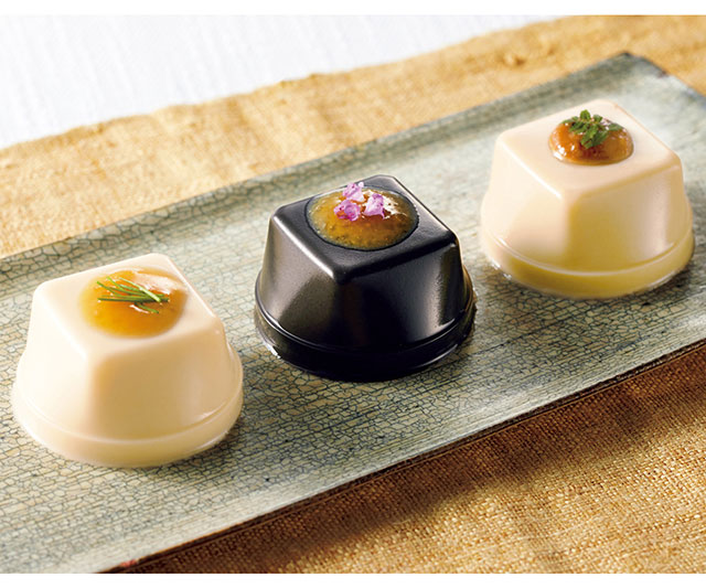 香り高い練り胡麻と吉野葛を使用し、もっちりとした食感に仕上げた一口サイズの胡麻豆腐です。2種のこだわりのたれと、お好みの組合せでご賞味ください。