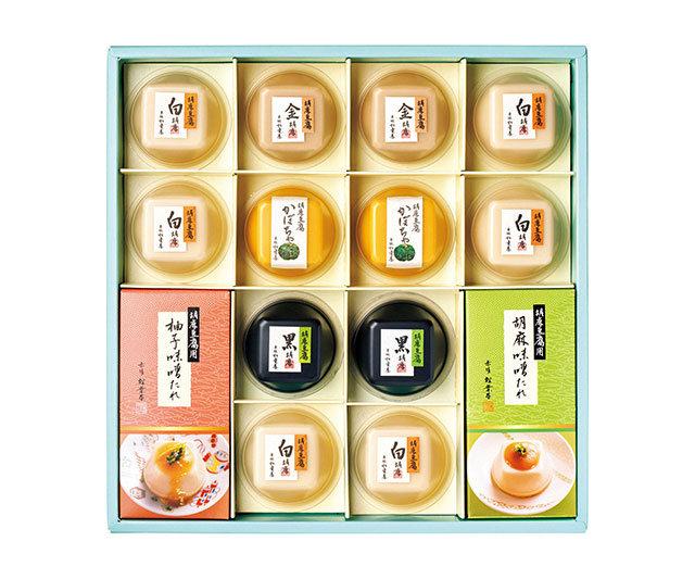 - 白胡麻豆腐×6、金胡麻豆腐・かぼちゃ胡麻豆腐・黒胡麻豆腐×各2、各43g、柚子味噌たれ・胡麻味噌たれ各7g×各6