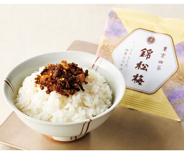 鰹節、白胡麻、きくらげ、松の実などを醤油と砂糖で調味した佃煮風ふりかけを、使いきりサイズでご用意しました。ご飯のお供のほか、麺に和えるのもおすすめです。