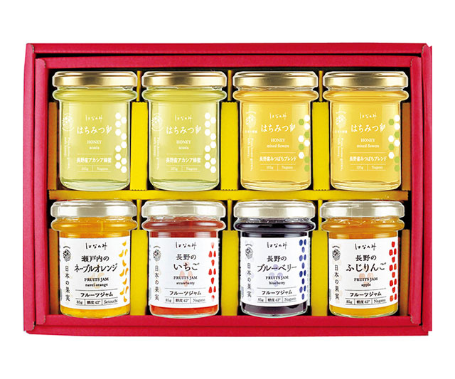 - フルーツジャム(瀬戸内のネーブルオレンジ・長野のいちご・長野のブルーベリー・長野のふじりんご各85g×各1)、自社養蜂蜂蜜(長野産アカシア蜂蜜・長野産みつばちブレンド各105g×各2)