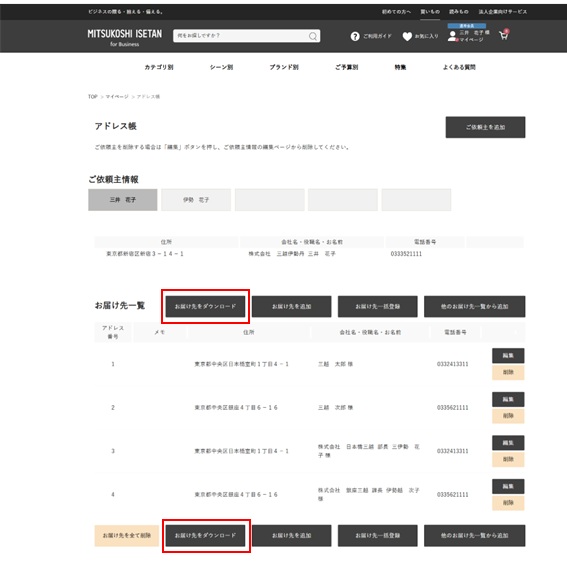 移行したいご依頼主情報を選択し、お届け先をダウンロードをクリック。