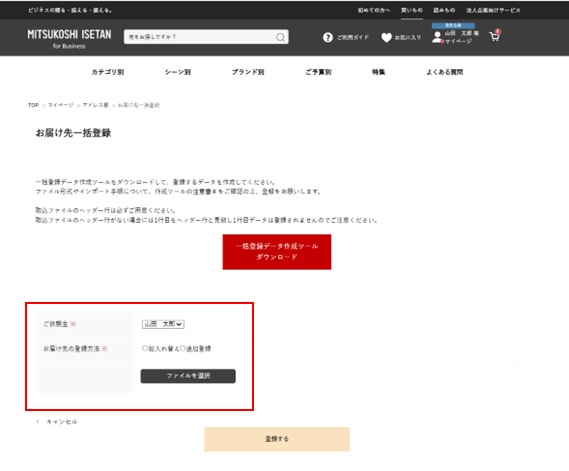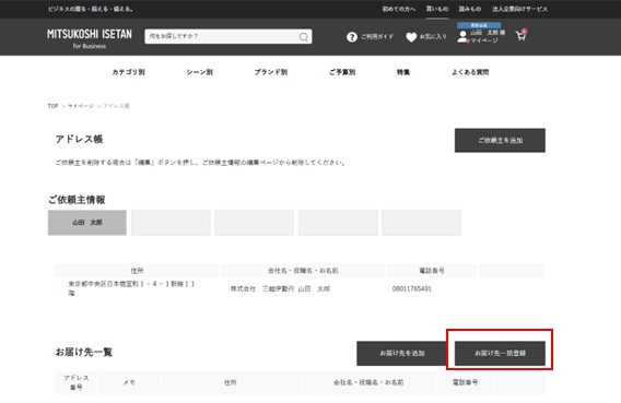取り込みたいご依頼主名を選択し、お届け先一括登録をクリック。