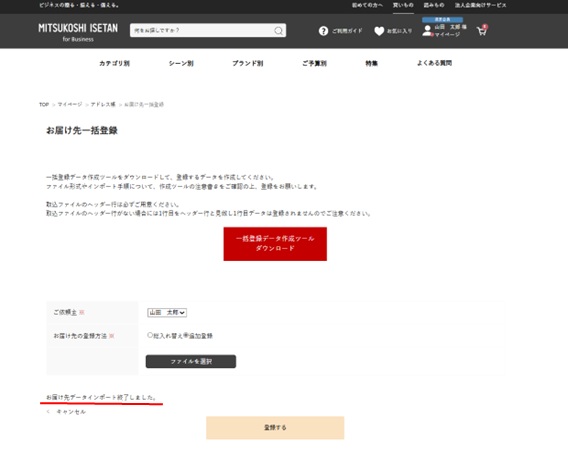 取り込みが完了すると「お届け先データインポート終了しました。」と表示されます。