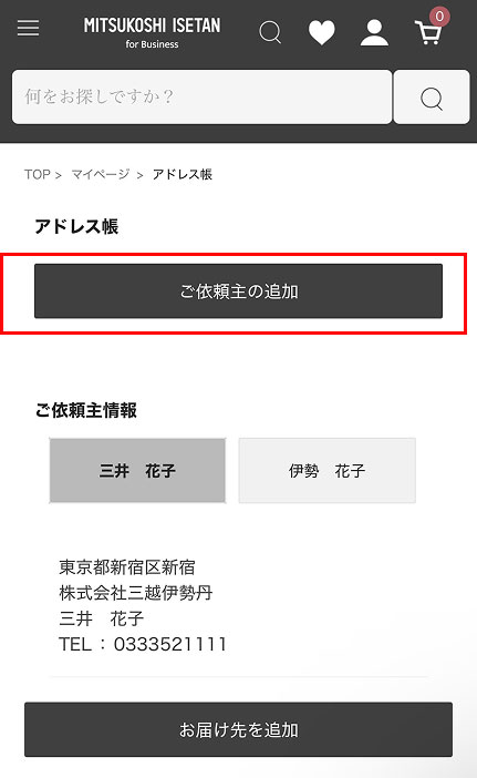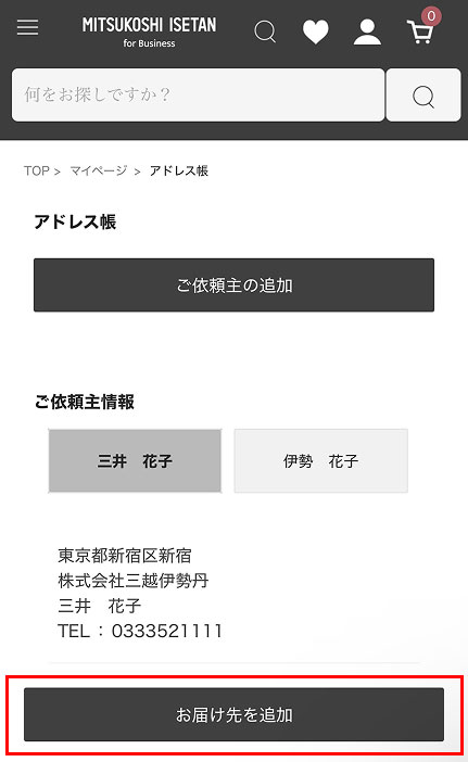 - お届け先を1件ずつ新規登録する場合は[お届け先を追加]を選択します。