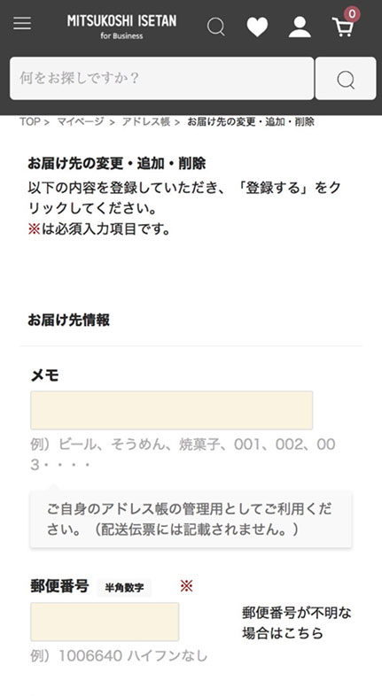 メモにキーワードを入力しておくと、アドレス帳からお届け先を呼び出す際に目印となり便利にお使いいただけます。