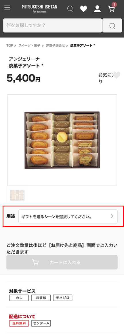 - サービス、配送名等の各種マークを確認してから用途をプルダウン選択し、右下の[カートへ入れる]をタップします。