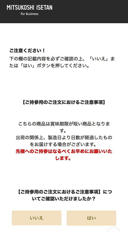 - ※賞味期限が短い商品(60日以内)については[カートへ入れる]をタップした後注意事項が表示されます。ご確認の上、ボタンを押してください。
