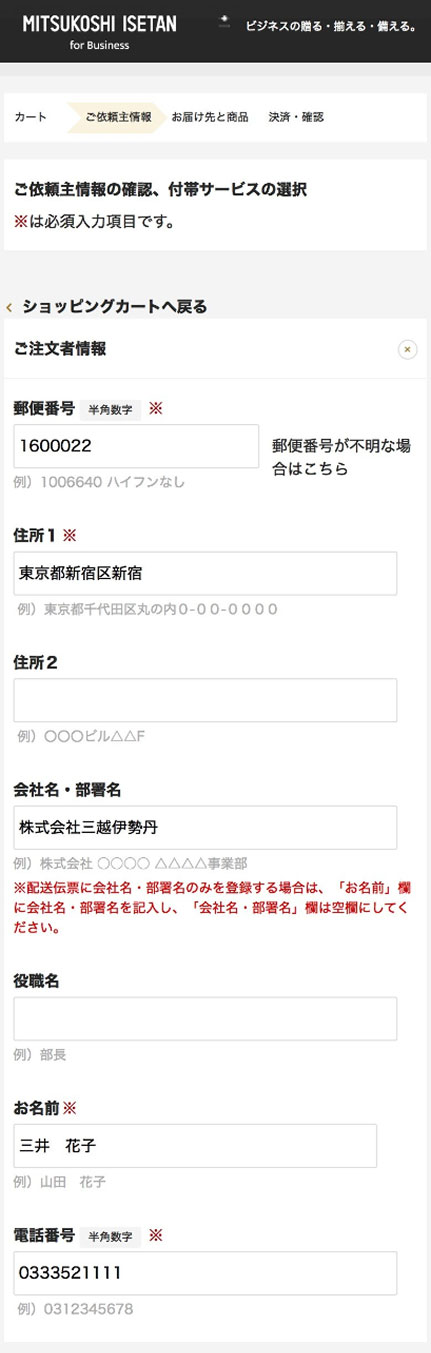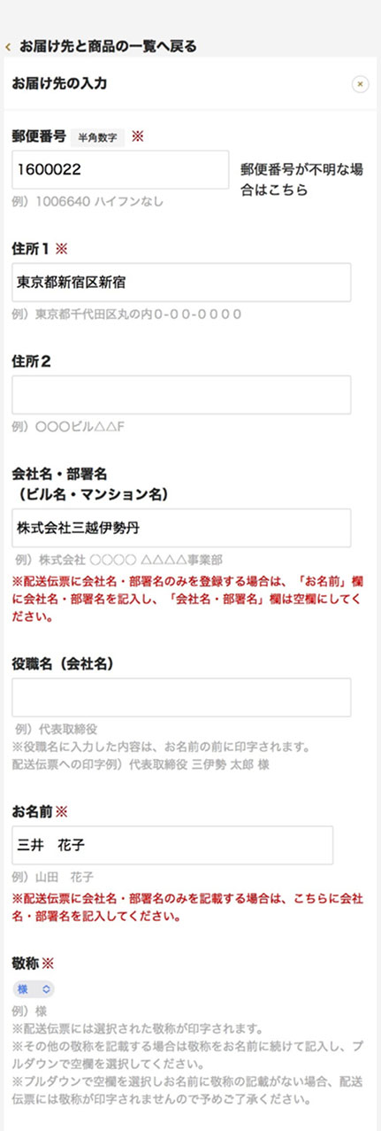 ※配送伝票に会社名・部署名のみを登録する場合は。「お名前」欄に会社名・部署名を記入し、「会社名・部署名」欄は空欄にしてください。