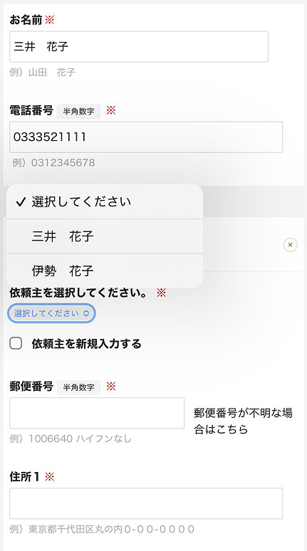 - ご依頼主をプルダウンから選択してください。アドレス帳に登録してある依頼主から選択できます。